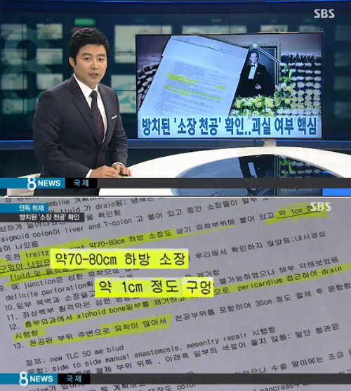 SBS가 공개한 수술 기록에는 신해철의 소장 아래 70cm~80cm 지점에 1cm 크기의 천공을 발견했다고 돼 있다.
