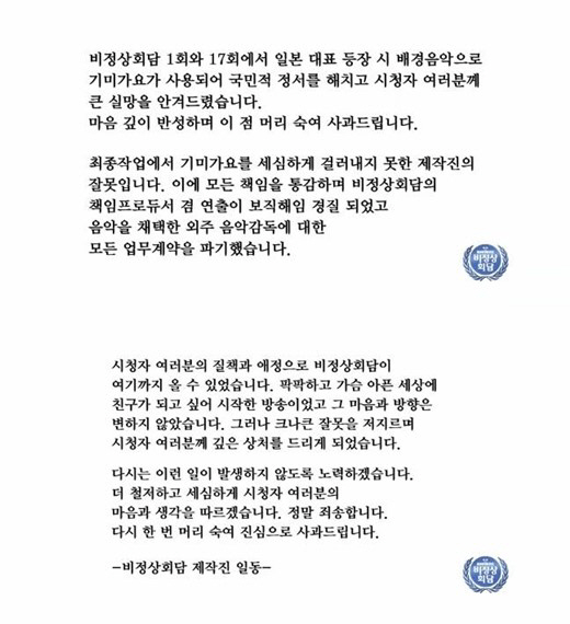 3일 밤 '비정상회담' 방송에 앞서 "'비정상회담' 1회와 17회에서 일본 대표 등장 시 배경음악으로 기미가요가 사용되어 국민적 정서를 해치고 시청자 여러분께 큰 실망을 안겨드렸습니다. 마음 깊이 반성하며 이 점 머리 숙여 사과드립니다. 최종작업에서 기미가요를 세심하게 걸러내지 못한 제작진의 잘못입니다. 이에 모든 책임을 통감하며 '비정상회담'의 책임프로듀서 겸 연출이 보직해임 경질되었고 음악을 채택한 외주 음악감독에 대한 모든 업무계약을 파기했습니다"는 내용의 제작진이 사과문이 공개됐다.