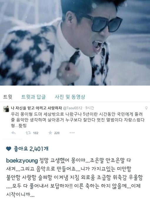 또 김태우는 자신의 트위터를 통해 "우리 몽이형 드디어 세상 밖으로 나왔구나. 5년이라는 시간 동안 국민에게 들려줄 음악만 생각하며 살아온 거 누구보다 잘 안다. 멋진 앨범이다. 자랑스럽다 형. 화이팅"이라며 MC몽에 대한 애정을 표현했다.