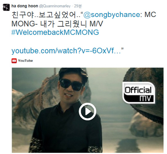 하하는 3일 자신의 트위터를 통해 "친구야... 보고 싶었어"라는 멘트와 함께 MC몽의 뮤직비디오 영상 링크를 게재하며 MC몽의 복귀를 응원했다.