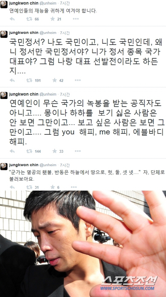 특히 진중권 교수는 "연예인이 무슨 국가의 녹봉을 받는 공직자도 아니고 보기 싫으면 안보면 그만 에블바디 해피"라며 "나도 국민이고 니도 국민인데 왜 니 정서만 국민정서야? 니가 정서 종목 국가대표야? 그럼 나랑 대표 선발전이라도 하던지. 연예인들의 재능을 귀하게 여겨야합니다"라고 지적했다.
