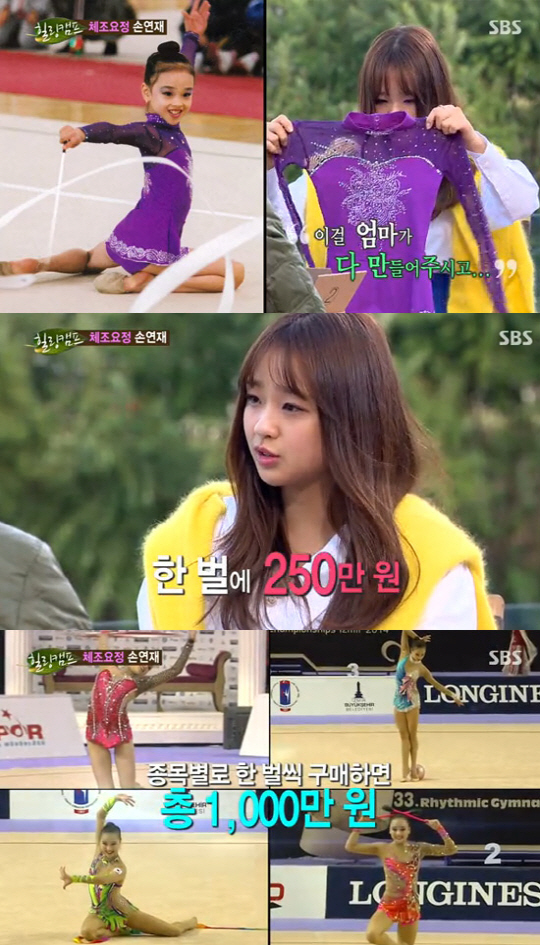 그러자 손연재는 "지금 입는 경기복은 한 벌에 250만 원정도 한다. 종목별로 네 벌 해야 하고..."라며 "이때는 그렇게까지 안했지만 경기복 자체가 너무 비싸서 엄마가 만들어주셨다"고 말했다.