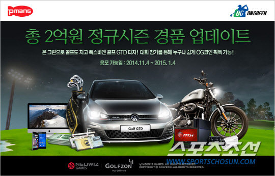 네오위즈게임즈는 'OG'의 공개서비스를 기념해 내년 1월 4일까지 'OG코인샵'을 통해 폭스바겐 골프 GTD, 할리데이비슨 스포스터 XL 883N 아이언, 마루망 아이언세트, 아이맥 레티나 5K 디스플레이, 아이폰6 플러스, 100만원 여행 상품권 등 총 2억원 상당의 경품을 증정한다. 이용자들은 게임접속, 시즌 대회 참여, 미션 수행, 레벨 달성 등을 통해 획득한 OG코인을 사용해 상품 소진 수량까지 선착순으로 원하는 경품을 100% 교환할 수 있다.