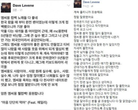 데이브는 4일 자신의 SNS에 "MC몽 컴백 노래들 다 좋네. 한국 왔을 때부터 완전 팬이었는데 이렇게 컴백하니 기분 좋아"라며 "악플 다는 XX들 좀 어이없어. 왜 5년 동안 MC몽 비난하나. 난 군대 안 가는 외국인이라서 공감 안 되는데…. 욕 계속 먹어야 돼? MC몽 후회 안했겠어? 왜 그래 키보드워리어. 사람은 원래 실수해"라는 글을 올렸다.