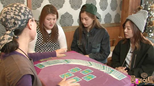 최근 '룸메이트' 녹화에서 이국주 써니 나나는 '여자들만의 데이트'라는 콘셉트로 함께 삼청동 나들이에 나서 눈길을 끌었다. 산책을 하던 이국주와 나나는 타로집을 발견하자 호기심을 내비쳤고, 한 번도 점을 본 적이 없다며 망설이는 써니를 이끌고 타로점을 보기로 했다.