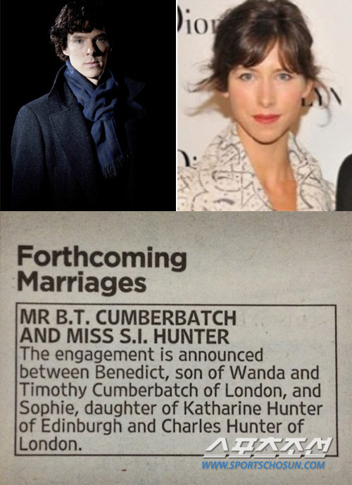 5일(현지시각) 미국 연예매체 스플래쉬닷컴에 따르면, 컴버배치 측은 이날 발행된 영국 타임지 경조사란을 통해 배우 소피 헌터와의 약혼 소식을 알렸다.