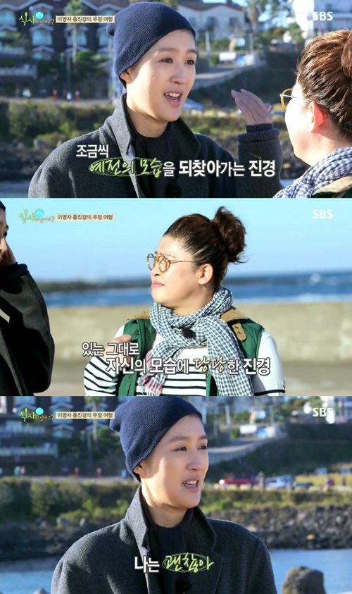 홍진경은 "총각이라는 말을 들었을 때 부끄럽거나 그렇지 않느냐"는 질문에 "죄지은 게 아니라 치료받으며 빠진 건데 어쩔 수 없지 않나. 예전에는 눈썹도 없었는데 지금은 많이 났다"고 답했다. 이어 "그동안 패션 쪽 일 하느라 삭발한 적도 많다. 그래서 이렇게 다닐 수 있는 것 같다"고 덧붙였다.