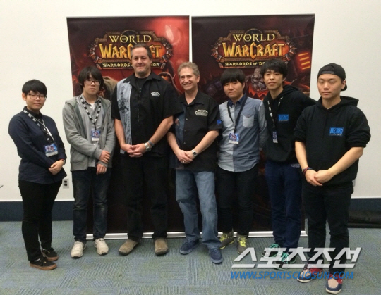 '블리즈컨 2014' 현장을 찾은 한국의 5명 고등학생 참가자들이 블리자드 마이크 모하임 CEO(왼쪽에서 네번째), 그리고 제이 알렌 브렉 총괄 프로듀서(왼쪽에서 세번째)와 애너하임컨벤션센터에서 만남을 갖고 기념 촬영을 하고 있다. 사진제공=블리자드