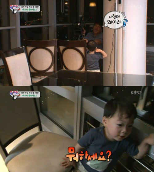이에 VJ는 더욱 당황했고, 포기했던 민국와 대한이 마저 합세해 "아저씨 뭐하세요?"라고 말하며 궁금해했다. 급기야 이들은 VJ를 관람하기 위해 식탁의 모든 의자를 끌어다가 관람석까지 완성해 웃음을 자아냈다.