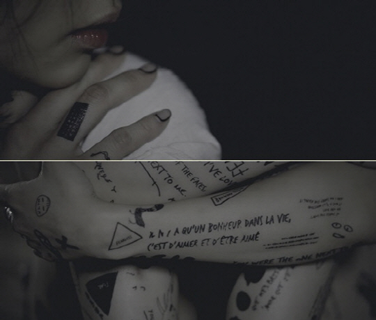 사진 속에는 니콜의 얼굴과 신체의 일부분들이 노출 돼 있다. 특히 니콜의 팔다리 등에 영어, 불어 등 여러 언어로 적힌 메시지들과 기호, 수식, 그림 등이 마치 암호처럼 난해하게 새겨져 있어 어떤 의미를 암시하는 지 궁금증을 자아낸다.