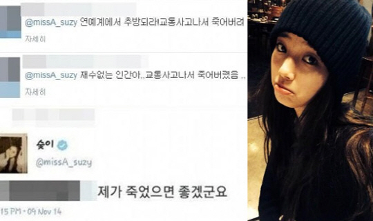 수지의 답변을 받은 트위터 이용자는 지난달 수지에게 "재수 없는 인간아. 교통사고 나서 죽어버렸음"이라는 글을 남겼으며, 9일에는 "연예계에서 추방되라. 교통사고 나서 죽어버려"라며 지속적으로 수지에게 악의적인 메시지를 적어 보는 이들의 눈살을 찌푸리게 했다.
