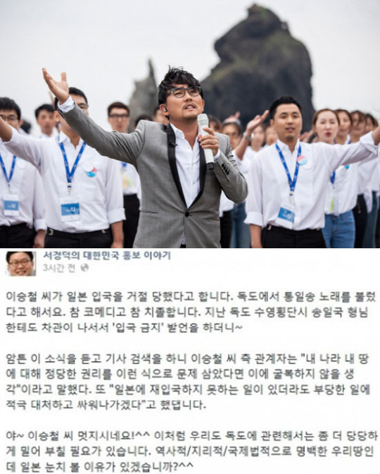 서경덕 교수는 10일 자신의 페이스북에 "이승철 씨가 일본 입국을 거절 당했다고 합니다. 독도에서 통일송 노래를 불렀다고 해서요. 참 코메디고 참 치졸합니다"라며, 지난 독도 수영횡당한 배우 송일국에게도 '입국 금지' 발언을 한 사실도 언급했다.