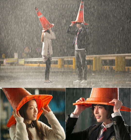 12일 첫 방송되는 SBS 수목드라마 '피노키오'(극본 박혜련, 연출 조수원)의 한 장면. 공개된 스틸 속 이종석과 박신혜는 주룩주룩 내리는 비를 피하기 위해 라바콘을 고깔 모자처럼 머리에 쓰고 서로를 기분 좋게 바라보고 있다. 길에 굴러다니는 지저분한 라바콘을 뒤집어 쓴 두 청춘 스타의 순수하면서도 엉뚱한 표정이 팬들의 마음을 설레게 한다. 박신혜(최인하 역)가 늦게 귀가하는 이종석(최달포 역)을 마중 나온 모습을 그린 장면. 지난달 말 인천 잠진도 선착장에서 촬영됐다.