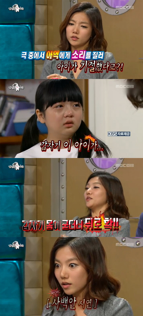 이에 이채영은 "13살짜리 아역인데 구석에 아이를 세워놓고 몰아세우는 연기 중에 아이가 갑자기 몸이 굳더니 뒤로 확 기절했다"고 당시 상황을 설명했다. 이어 "막 얘기하는데 상대방이 쓰러지니까 너무 무서워서 소리를 질렀다"며 "마침 병원 신이어서 응급실로 가 큰일은 없었다"고 덧붙였다.