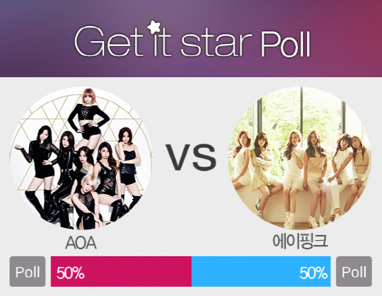 스타 스타일 매거진 어플리케이션 '겟잇스타'의 'Get it Star POLL' 의 125번째 대결은 컴백을 앞둔 두 걸그룹 AOA vs APINK의 대결입니다. 125번째 대결을 소개하기에 앞서, 지난주부터 진행된 신흥 예능 강자 대결의 진행 상황을 알아볼까요? GOT7의 잭슨과 M.I.B의 강남의 대결은 72% vs 28%로 잭슨의 승리가 예상됩니다!