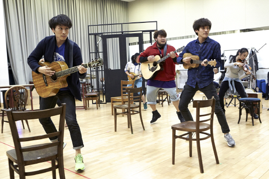 ◇오는 12월 CJ토월극장에서 개막하는 뮤지컬 '원스'. 배우들이 악기를 들고 열심히 연습하고 있다. 사진제공=신시컴퍼니