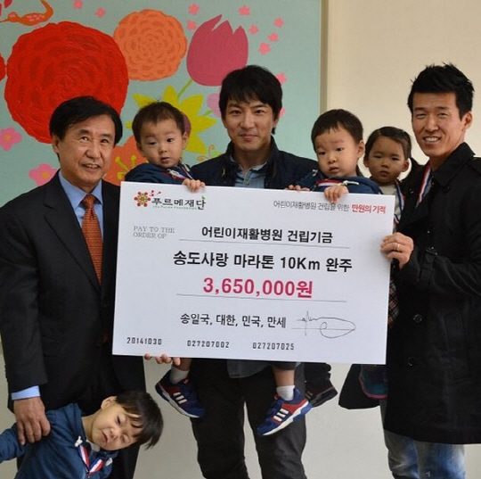 션은 17일 자신의 트위터에 "2014년 12번째 만원의기적 주인공, 대한, 민국, 만세 그리고 아빠 송일국 씨. 장애인 아시안게임 기념 송도사랑 마라톤 10km 완주 기념으로 어린이재활병원건립을 위해 함께 해주셨습니다. 송일국 씨 너무 수고 많으셨어요. 대한. 민국. 만세도 너무 고마워! 삼촌이 다음에 맛있는 까까 사줄게"라는 글과 사진을 게재했다.
