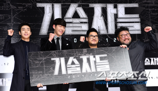 18일 오전 서울 광진구 자양동 롯데시네마 건대입구에서 영화 '기술자들' 제작보고회가 열렸다. 이현우, 김우빈, 김홍선 감독, 고창석이 포토타임에서 포즈를 취하고 있다.