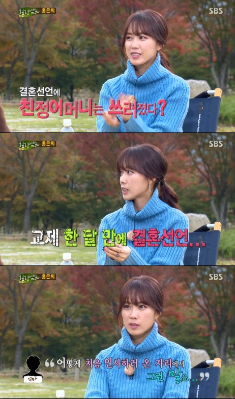 이날 홍은희는 "친정어머니가 쓰러지셨다면서요?"라는 MC 이경규의 말에 "진짜 쓰러지신 건 아니고, 머리를 싸매셨죠"라고 답했다.