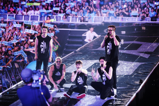 지난달 25일 서울 잠실종합운동장 주경기장에서 열린 앙코르 콘서트에 서 god 멤버들이 무대에서 어깨동무를 하고 있다. 사진제공=싸이더스hq