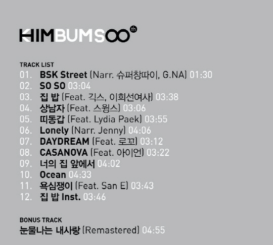 타이틀곡 '집 밥'은 힙합듀오 긱스가 참여해 앞서 공개된 티저 이상의 색다른 힙합 스타일 곡이 탄생할 것으로 예상돼 기대를 모은다. 특히 긱스와 함께 피처링에 적힌 이희선 여사는 실제 김범수 어머니의 이름인 것으로 알려져 노래에서 어머니가 어떤 활약을 펼쳤을지 기대를 모은다.