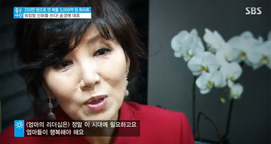 18일 방송된 SBS '좋은아침'에는 '250만 원으로 연 매출 3000억 원 회사로'라는 타이틀로 위킹맘 신화를 쓴 송경애 대표가 출연했다.