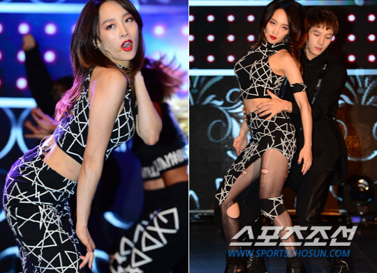 이날 니콜은 구멍 뚫린 과감한 스타킹에 허리라인을 노출한 섹시한 의상으로 타이틀 곡 'MAMA'를 열창해 시선을 사로잡았다.
