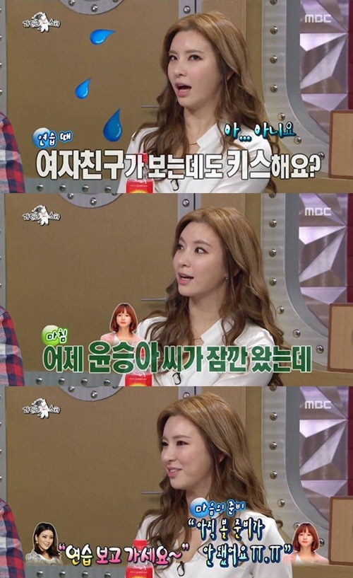 이에 MC들은 "김무열 여자친구가 보는 앞에서도 키스신을 하느냐"고 물었고, 정선아는 "연습하는 거 보고 가라고 하는데 윤승아가 '아직은 마음의 준비가 안 됐다'며 보지 않고 갔다"고 답해 눈길을 끌었다.
