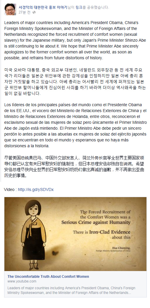 뉴욕타임스 등 전 세계 주요 매체에 일본의 역사왜곡을 비판하는 광고를 꾸준히 게재해 온 한국 홍보 전문가 서경덕 성신여대 교수가 이번에는 전 세계 페이스북 사용자들을 대상으로 일본 아베 총리 비판 광고를 올렸다.