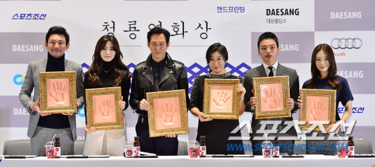 20일 오후 서울 영등포구 여의도동 CGV 여의도에서 제35회 청룡영화상 핸드프린팅이 열렸다.배우 황정민(왼쪽부터), 한효주, 이정재, 라미란, 여진구, 박지수가 포즈를 취하고 있다. 핸드프린팅 행사에는 '신세계'로 남우주연상을 거머쥔 황정민과 '감시자들'로 여우주연상을 받은 한효주, 남우조연상 수상자 '관상'의 이정재, 여우조연상 수상자 '소원'의 라미란, '화이: 괴물을 삼킨 아이'로 신인남우상을 거머쥔 여진구, 신인여우상 수상자인 '마이 라띠마'의 박지수 등 영광의 주인공들 6명이 참석했다. 특히 올해 핸드프린팅 행사는 봉만대 감독이 MC를 맡아 눈길을 끌었다. 2014년 피날레를 장식할 한국영화 축제의 밤, 제35회 청룡영화상 시상식은 12월 17일 세종문화회관에서 열린다. 김경민 기자 kyungmin@sportschosun.com/2014.11.20.