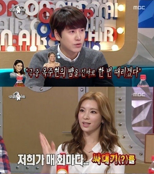 이에 규현은 "근데 한 인터뷰에서 '극중 옥주현의 뺨을 진짜로 한 번 때리겠다'는 말을 하신적이 있던데"라고 언급하자 정선아는 "'위키드' 공연에서 내가 매 회마다 싸대기를 때리는 신이 있다"며 "장난삼아 '옥주현의 뺨을 후려 갈기겠습니다'라고 했는데 실제 공연 때는 내가 세 번이나 맞았다"고 말해 웃음을 자아냈다.