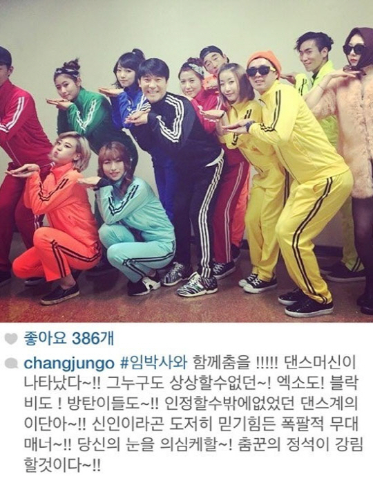 공개된 사진에는 다양한 색상의 트레이닝 복을 입은 댄서들과 함께 코믹한 포즈를 취하고 있어 재미를 더했다.