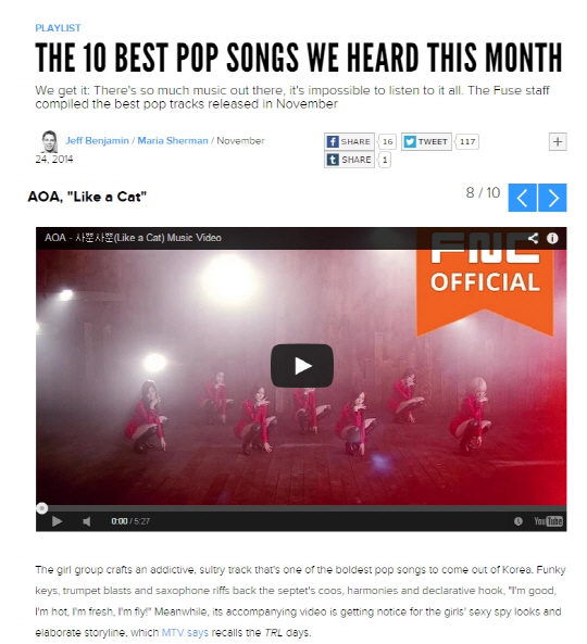 27일 미국 음악전문 채널 퓨즈TV에 따르면 AOA의 '사뿐사뿐'(영문명 'Like a Cat')은 퓨즈TV 스태프들이 선정한 11월의 베스트 팝송 10곡 중 한 곡으로 선정됐다. 11월 국내 가요시장에서는 올해 가장 치열한 순위 경쟁이 벌어진 가운데 AOA의 '사뿐사뿐'은 국내는 물론 아시아권 음악으로 유일하게 이름을 올렸다.