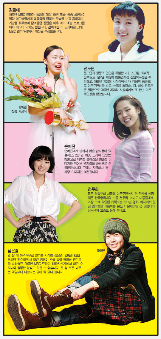 시상식의 꽃은 '여우주연상'입니다. 한 달 앞으로 다가온 제35회 청룡영화상 시상식. 그 하이라이트를 장식할 여우주연상 후보들이 공개됐습니다. 김희애(우아한 거짓말), 전도연(집으로 가는 길), 손예진(공범), 천우희(한공주), 심은경(수상한 그녀). 한국영화를 이끌어온 관록의 배우들과 미래를 책임질 배우들이 모두 한자리에 모였습니다. 지금은 스크린의 꽃이지만 아직은 꽃봉오리였던 시절, 이들의 풋풋한 모습이 궁금해졌습니다. 한번 만나보실까요?