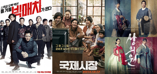'빅매치'가 극강 오락영화라면 12월 17일 개봉하는 '국제시장'은 감동 극화다. '국제시장'은 우리시대 아버지의 삶을 굴곡진 현대사와 함께 그려내고 있다. 연출을 맡은 윤제균 감독은 "70년대까지 시대의 화두는 경제화였다. 50~70년까지 경제화를 위해 허리띠를 졸라 맨 시기에 대한 선택과 집중이 필요했다"고 배경에 대해 설명하기도 했다. 때문에 영화는 흥남 철수, 파독광부와 간호사, 월남 파병, 이산가족 상봉 등 눈물의 현대사가 등장한다.