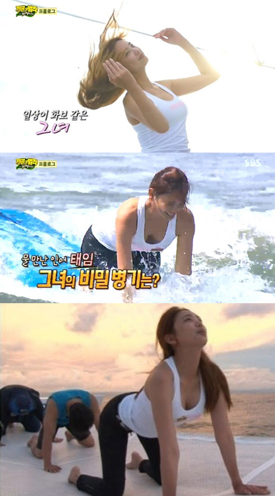 뿐만 아니라 이태임은 서핑보드 위에서도 요가 동작 중 고양이 자세를 선보이며 환상의 몸매 라인을 공개해 남성 팬들의 환호를 받았다.