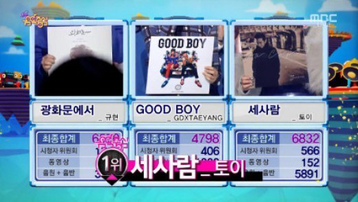 29일 방송된 MBC '쇼! 음악중심'에서는 토이 '세 사람'이 규현 '광화문에서'와 GD&태양 'Good boy'를 제치고 1위에 등극했다.