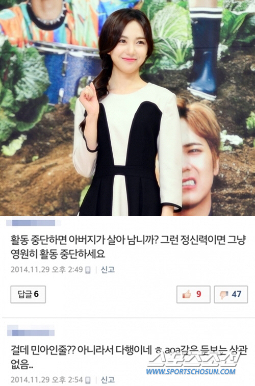 이 소식에 많은 네티즌들은 AOA 민아의 부친상에 안타까움을 표하고 있지만, 일각에서는 "활동 중단하면 아버지가 살아나느냐", "그런 정신력이면 그냥 영원히 활동 중단해라", "걸스데이 민아인지 알았다", "AOA라면 상관없다" 등의 악플을 남겨 씁쓸함을 자아낸다.