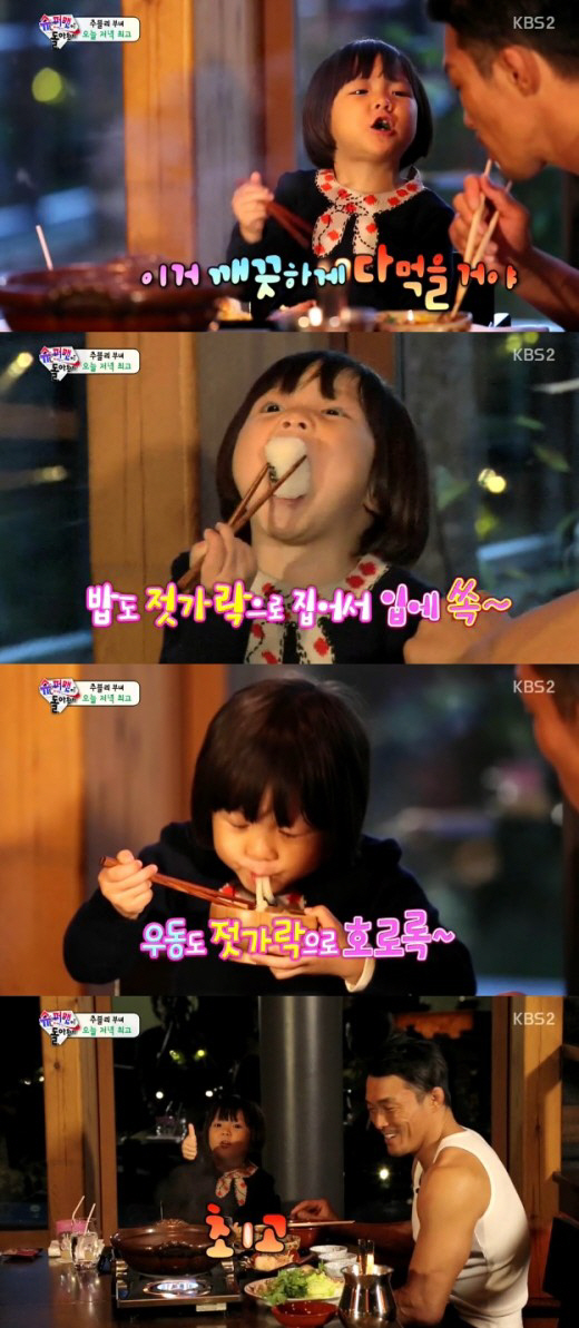 사랑이는 아빠의 도움 없이 젓가락을 사용해 음식을 집어먹기 시작했다.