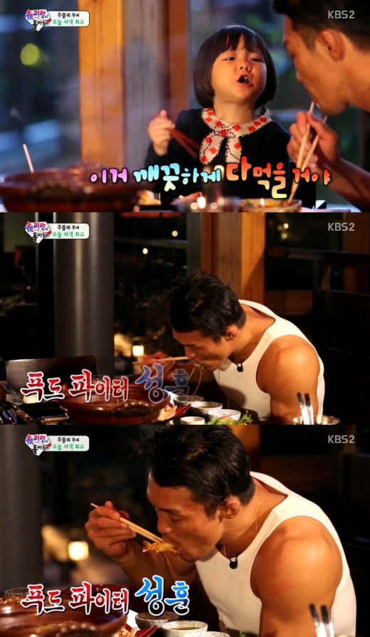 이날 추성훈은 밥을 먹는 사랑이의 모습에 흐뭇해하며 본격적으로 식사를 시작했다.