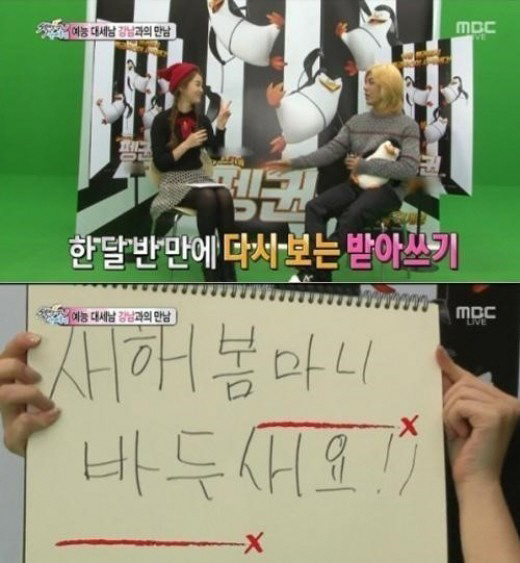 리포터는 '새해 복 많이 받으세요'이라고 읽었고, 강남은 "'새해 봄 마니 바두새요"라고 받아 적어 시청자들의 폭소를 자아냈다.