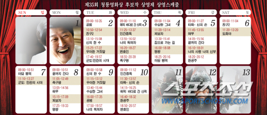 올 한해 관객들에게 눈물, 콧물, 웃음, 긴장, 환희를 줬다 뺐었다 했던 최고의 영화들이 한 자리에 모인다. 2일부터 10일까지 서울 여의도 CGV에서 열리는 제35회 청룡영화상의 후보작 상영제. 평일은 하루 5회, 주말은 하루 2차례 청룡영화상의 후보작들이 상영된다. 상영제 기간 동안 제34회 청룡영화상 후보작 21편이 골고루 배치돼 있다. 영화를 보면서 12월17일에 열릴시상식에 노미네이트 된 주인공들의 수상 가능성을 점쳐보는 것도 또 다른 관전 포인트.
