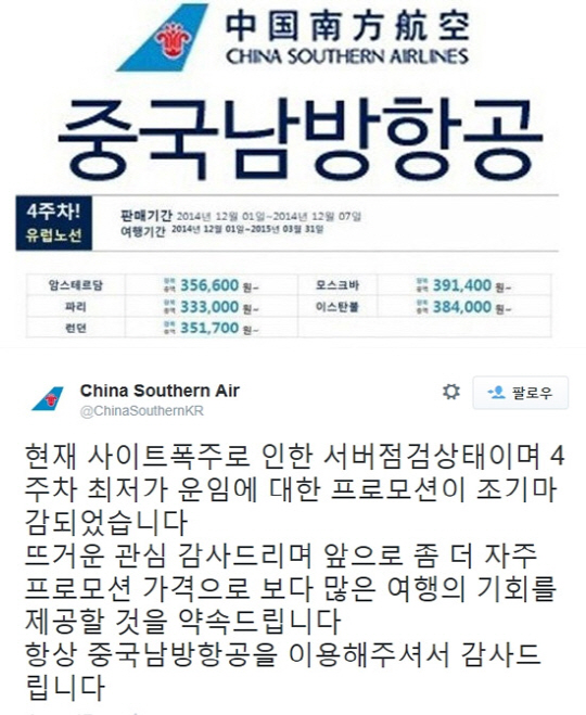 중국남방항공은 1일 공식 트위터 계정에 "현재 사이트 폭주로 인한 서버점검 상태이며 4주차 최저가 운임에 대한 프로모션이 조기 마감됐다"라고 알렸다.