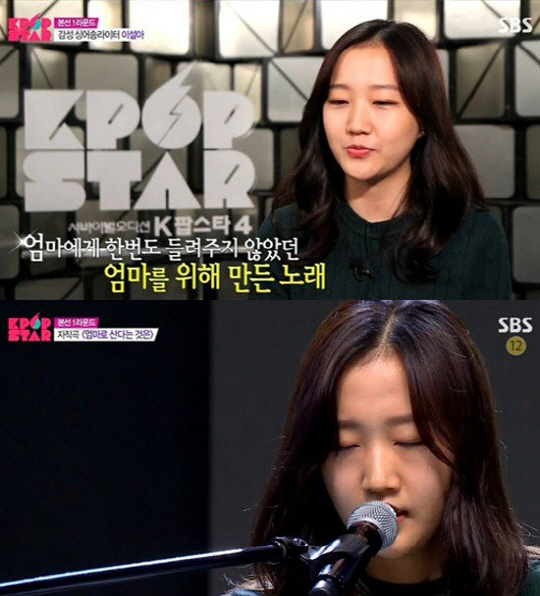지난달 30일 방송된 SBS '일요일이 좋다-서바이벌 오디션 K팝스타4'에서는 인천 출신의 21살 이설아가 출연해 자작곡 '엄마로 산다는 것은'을 열창해 심사위원들의 남다른 평가를 받았다.