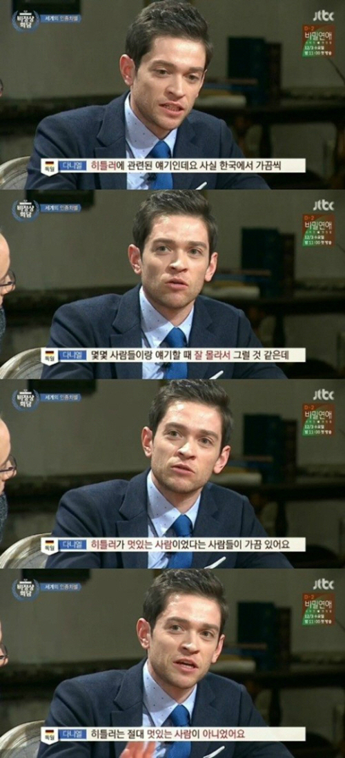 이날 자국의 인종차별에 대해 이야기하던 중 다니엘은 "한국 사람들 중에 히틀러에 대해 잘 모르는 사람이 있는 것 같다"며 운을 뗐다.