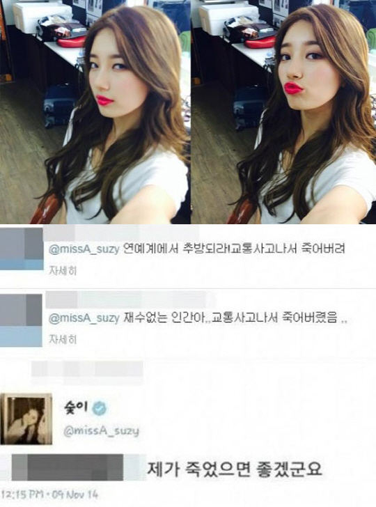 앞서 수지는 A씨가 남긴 글에 "제가 죽었으면 좋겠군요"란 답글을 달았다 논란이 되자 A씨는 해당 글들을 삭제하기도 했다. 이에 소속사 JYP엔터테인먼트 측은 지난달 11일 "댓글을 남긴 누리꾼을 찾아 처벌해달라"며 경찰에 고소장을 접수했다고 밝혔다.