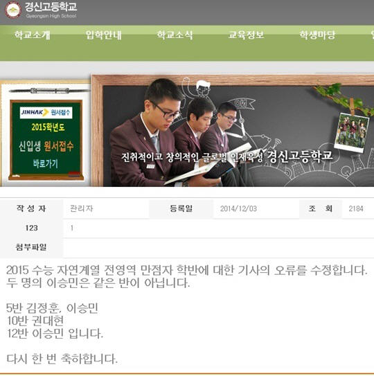 해당 글을 통해 대구 경신고는 동명이인 만점자 이승민이 같은 반이라는 언론 보도에 대해 바로잡았다. 대구 경신고측은 "2015 수능 자연계열 전영역 만점자 학반에 대한 기사의 오류를 수정합니다. 두 명의 이승민은 같은 반이 아닙니다. 5반 김정훈, 이승민 10반 권대현 12반 이승민 입니다"고 설명했다.