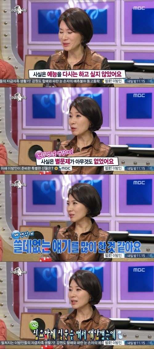 이날 황영희는 과거 '라디오스타-해치지 않아' 특집 당시 출연을 거절했던 것에 대해 "예능 프로그램을 다시 하고 싶지 않았다"고 밝혔다.