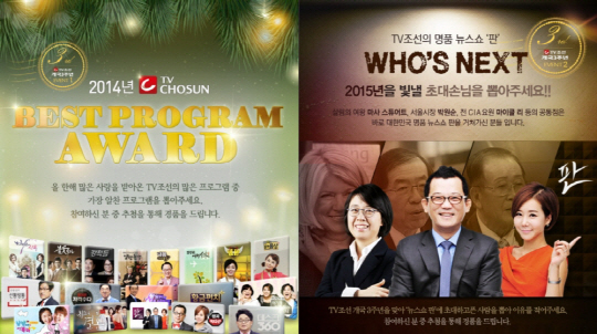 가장 눈길을 끄는 것은 2014년 시청자들로부터 가장 많은 사랑을 받은 TV조선 프로그램을 뽑는 '베스트 프로그램 어워드'(12월 5일~12월 31일)다. 보도, 시사, 교양, 예능, 드라마 등 모든 장르를 망라해 올해 TV조선을 통해 방송된 프로그램 중 가장 마음에 드는 프로그램을 선택하고, 그 이유를 적으면 된다. TV조선 홈페이지(http://www.tvchosun.com) 이벤트 게시판을 통해 누구나 참여할 수 있다.