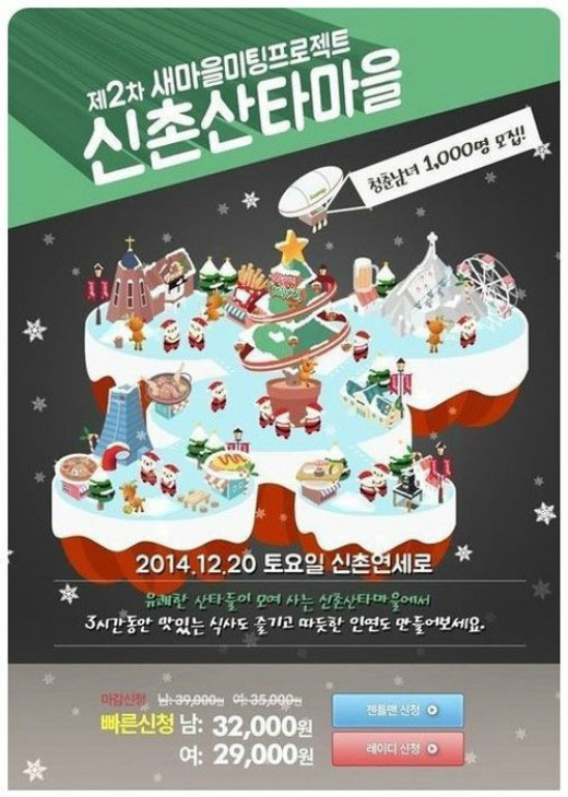 최근 새마을미팅프로젝트는 공식 홈페이지를 통해 오는 20일 일본의 '마치콘'을 모티브로 맛집탐방과 미팅이라는 콘셉트의 '새미프 신촌 산타마을' 행사를 개최한다고 전했다.